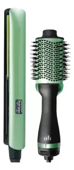 El Combo Cepillo Secador + Plancha Aguacate te permite secar, peinar y alisar al mismo tiempo, cuidando tu cabello y ahorrándote minutos todos los días.